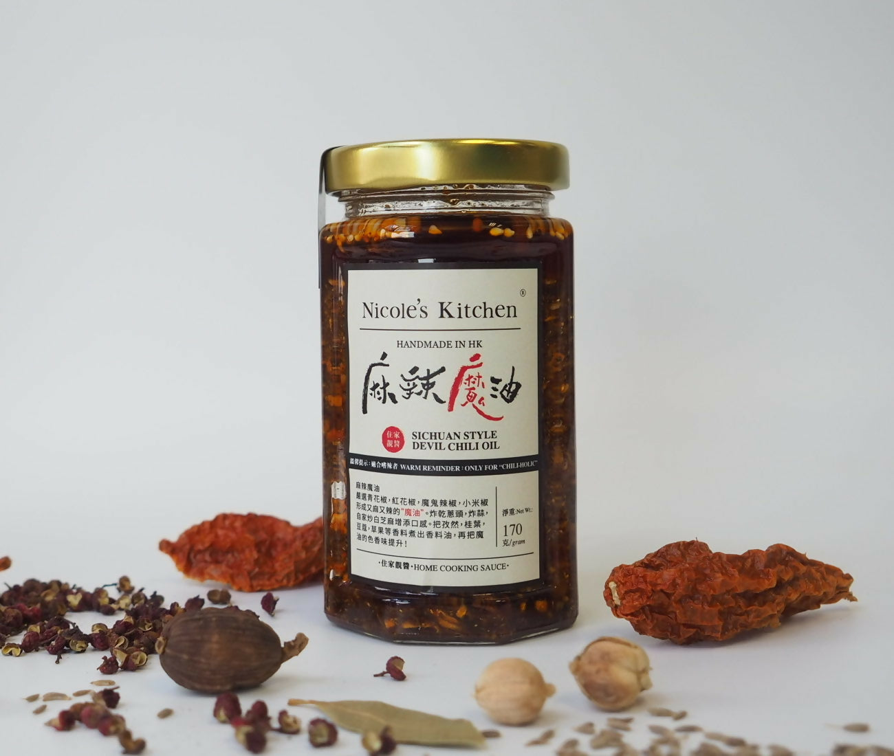 Ingredients: Vegetable Oil, Garlic, Shallot, Dried Chili, Devil Chili, White Sesame, Green Sichuan Pepper, Red Sichuan Pepper, Salt, Cumin Seed, Fennel Seed, Bay Leaf, Cardamomum, Tsaoko, Star Anise, Clove